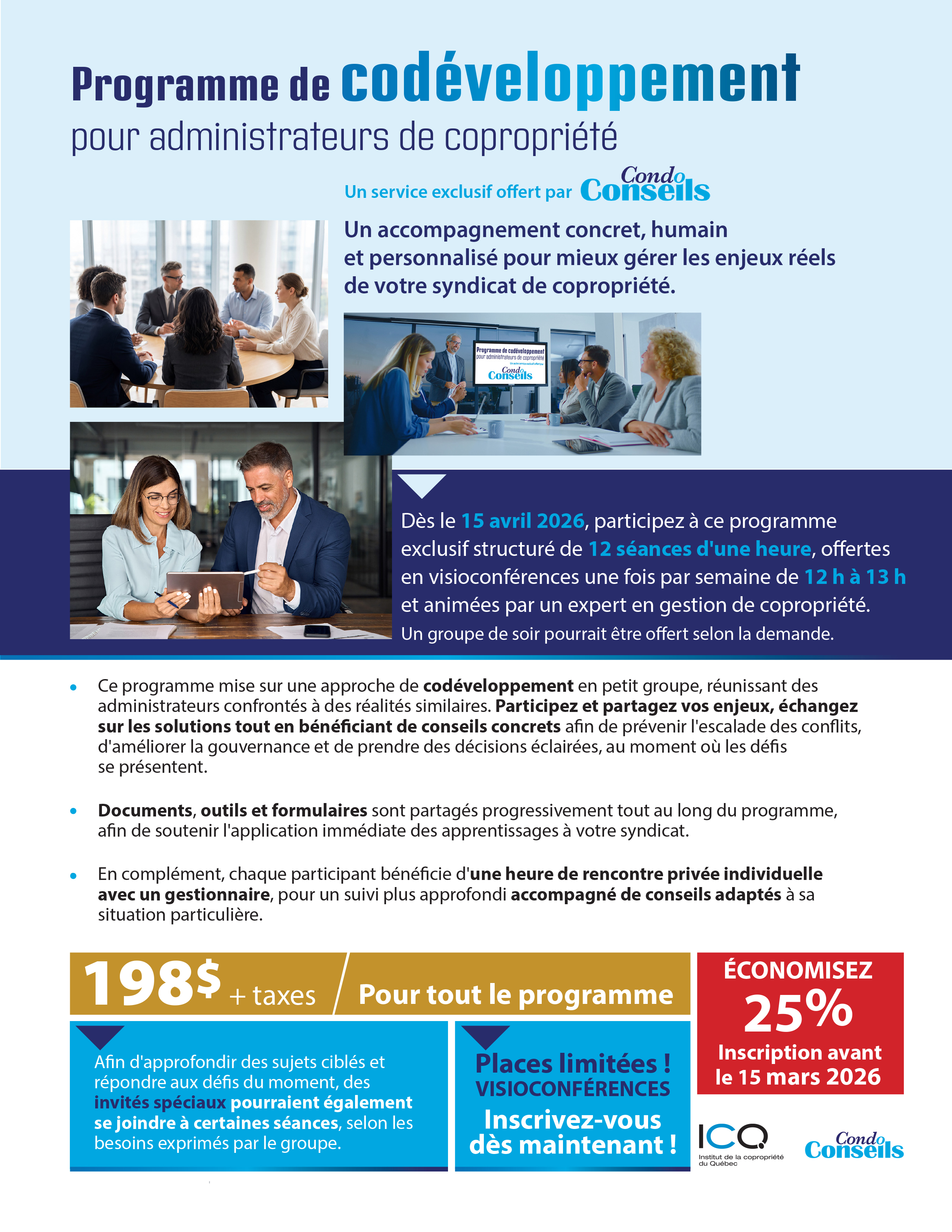 Institut de la Copropriété du QuébecL’Institut de la copropriété du Québec propose des cours de formation et des événements d'information ayant pour objectif de former les administrateurs et gérants de syndicats de copropriétés et associations de copropriétaires de condos, et ce, selon les lois et règlements en vigueur au Québec. CondoConseils est fière d’offrir ces cours en visioconférence afin de rejoindre le maximum de participants à travers toute la province.Gabriel Marcu